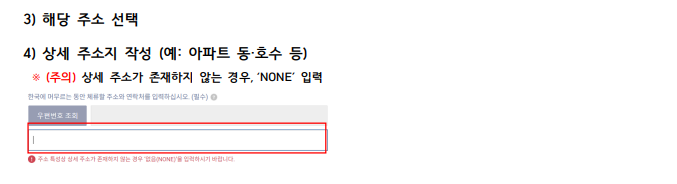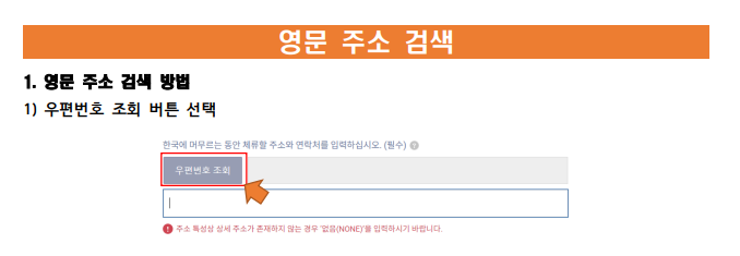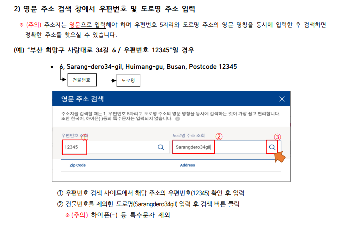 주소는 영어로 입력해야 합니다. 아래 사진을 참고해 주세요.