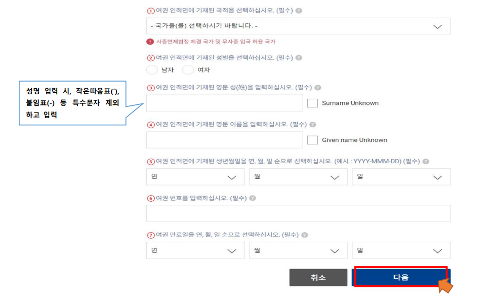 위에 나와있는 샘플 사진을 보고 순서대로 여권 정보를 적어 주세요.