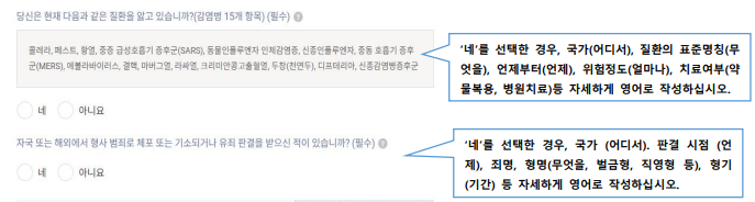 본국 혹은 해외에서 형사 범죄로 체포 또는 기소, 유죄 판결을 받은 경우 아니요로 체크해 주세요.