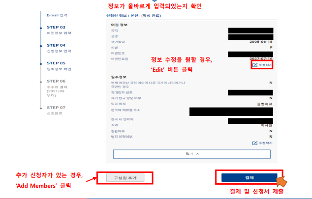 틀린 정보가 없는지 한번 더 확인 후 오른 쪽에 결제 버튼을 눌러 주세요. 추가 신청자가 있으신 분들은 왼쪽 버튼을 눌러 주세요.