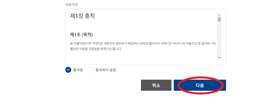 약관에 동의를 체크하고 다음을 눌러 주세요.