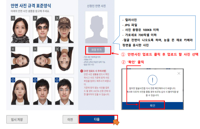 안면 사진을 등록해 주세요. (JPG 파일, 100KB이하 700픽셀 이하)